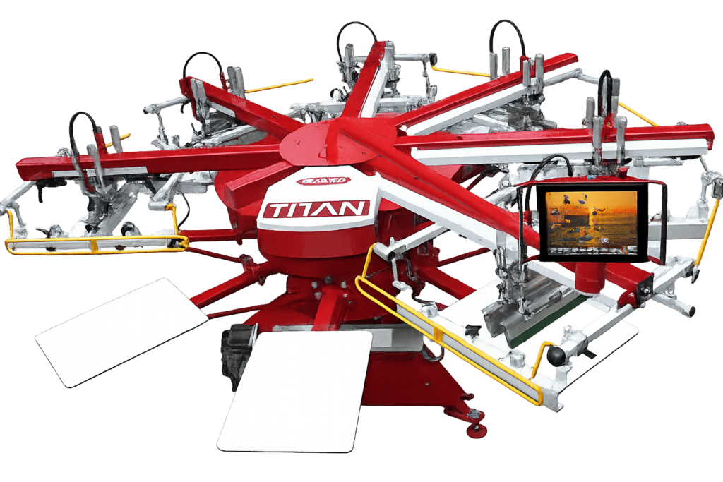 ANATO TITAN je poloautomatický 5 farebný sieťotlačový tlačový stroj značky ANATOL. Vďaka robustnej konštrukcii a inovatívnemu dizajnu vybavený mnohými osvedčenými dizajnovými prvkami, vrátane horných a dolných karuselov s kosoštvorcovými ložiskami, presného systému mikroregistrácie, obrábaného stredového hriadeľa a trojbodového systému na vyrovnávanie paliet.